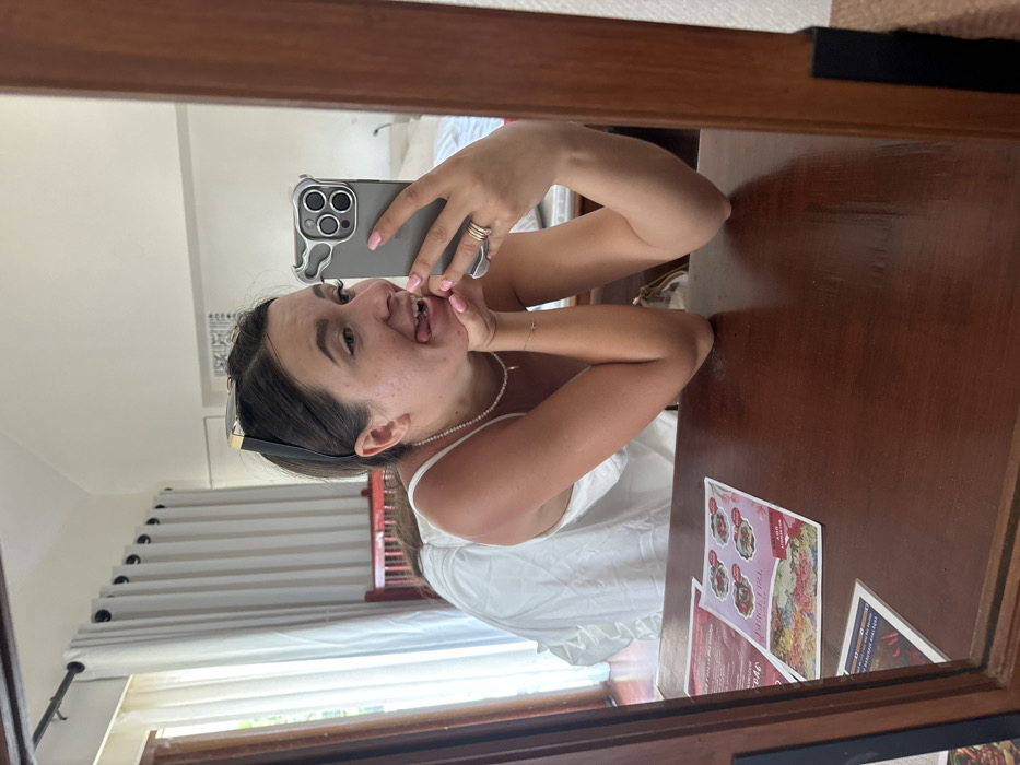 A young woman takes a selfie in a mirror. She holds an iPhone with a gray case. She wears a white top and a pearl necklace, and her black hair is pulled back. The room's interior is reflected in the mirror, showing a window with white curtains and a reddish object behind. Several brochures or menus lie on a wooden surface in front of the mirror. The mirror is framed in dark wood.