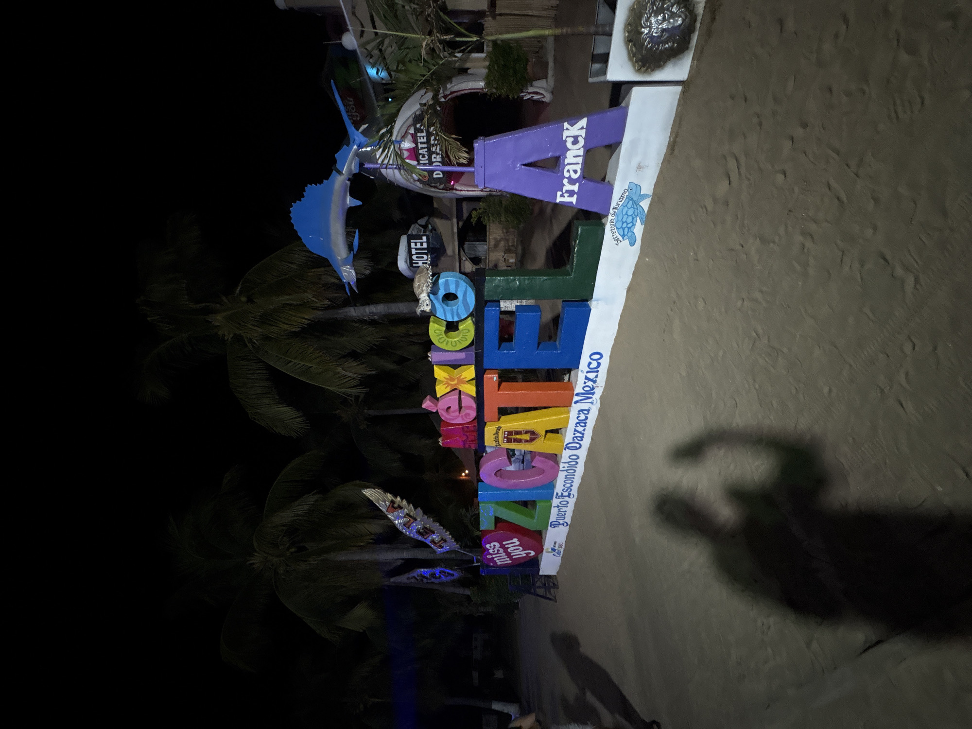 large, colorful sign that reads "Zicatela" in block letters of varying colors. Below "Zicatela", the sign reads "Puerto Escondido Oaxaca Mexico." Above the Zicatela lettering is a small sign with "Franck" in purple block letters. To the left of "Franck", a sign reads "HOTEL" above a small sign with the partial name "ICATELA D". A blue marlin fish statue is attached to the sign near the HOTEL sign. To the left of the sign, a palm tree is visible. The base of the sign sits on sand. The shadow of a person is visible in the lower right corner of the image. The location is Brisas de Zicatela, Mexico.
