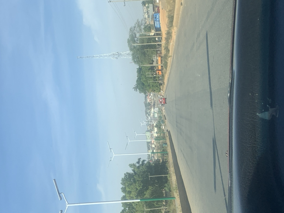 A straight, wide asphalt road stretches into the distance, flanked by low-rise buildings and greenery. Modern streetlights line the left side. A tall metal electrical tower rises in the middle ground. A red vehicle is visible further down the road. The perspective is from inside a car, showing part of the dashboard on the right. The sky is blue with some haze.