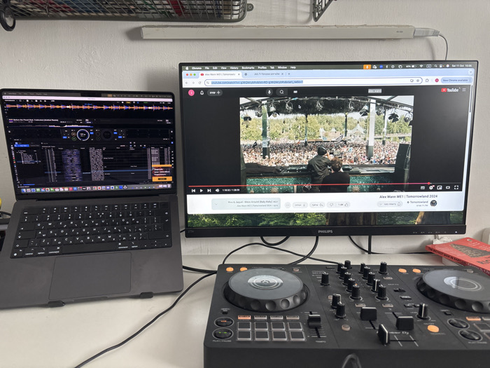 An indoor scene displays an electronic music production and DJ setup. The specific location within Rishon LeZion, Israel, as requested, is not discernible from the provided image. On the left, a dark gray MacBook laptop, positioned on a riser, is open with its screen displaying DJ software, characterized by audio waveforms, track lists, and various control interfaces in a dark theme. Its keyboard features English and possibly Hebrew characters. To the right of the laptop, a black Philips monitor is active, showing a YouTube video titled "Alex Wann WE1 | Tomorrowland 2024". The video depicts an outdoor stage with two DJs performing to a large crowd, set against a backdrop of trees. The macOS menu bar is visible at the top of the monitor, indicating "Sat 14 Oct". In the foreground, a black Pioneer DJ controller is situated on a desk surface. It features two jog wheels, numerous knobs, faders, and illuminated performance pads, with cables extending from its rear. A black USB cable connects the controller, likely to the laptop. A red-covered book titled "The Richest Man in Babylon" is partially visible on the far right, beside the monitor. The background consists of a plain white wall. A white metal wire shelf is mounted on the upper left portion of the wall, and a white power strip with multiple outlets is horizontally attached to the wall above the monitor, with a white cable plugged into it. The surface beneath the equipment is a light-colored desk. No individuals are present in the immediate environment shown in the photograph; people are only visible within the video displayed on the monitor.
