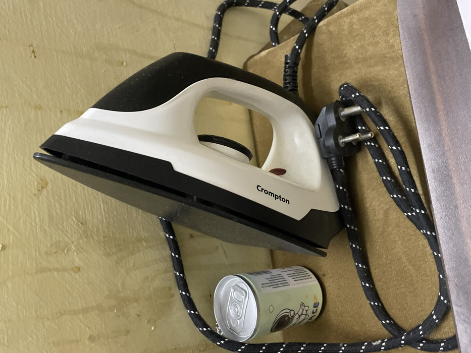 - "A black and white electric iron with the brand name Crompton is lying on a tan, textured surface" by FM-FvqkU2, licensed under CC BY 4.0