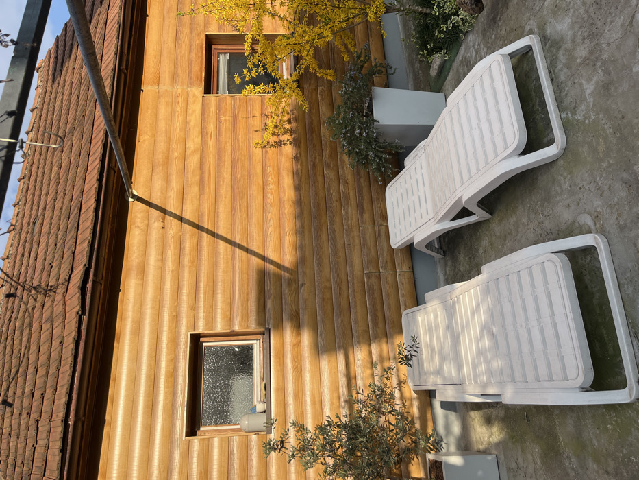 The image depicts an outdoor patio area adjacent to a building in the City of Zagreb, Croatia. The building features a horizontally paneled wooden facade in a light brown hue, topped by a terracotta-tiled roof and a brown gutter system. Two windows are visible on the facade; the left window is horizontal with textured glass and a light frame, holding a grey pot and a small white object on its sill. The right window is vertical with a dark frame and clear glass. A horizontal metal pipe runs across the upper frame, casting a diagonal shadow on the facade. The ground consists of a grey concrete or paved surface. Two empty white plastic lounge chairs are positioned on the pavement, with an olive branch resting on the left chair. Surrounding the chairs are various plants: a small olive tree in a white square pot on the left, a large shrub with yellow flowers (likely Forsythia) on the right, and a dark green shrub in a white rectangular planter between the chairs. The scene is illuminated by natural light, casting distinct shadows. No individuals are present, and no actions are observed.