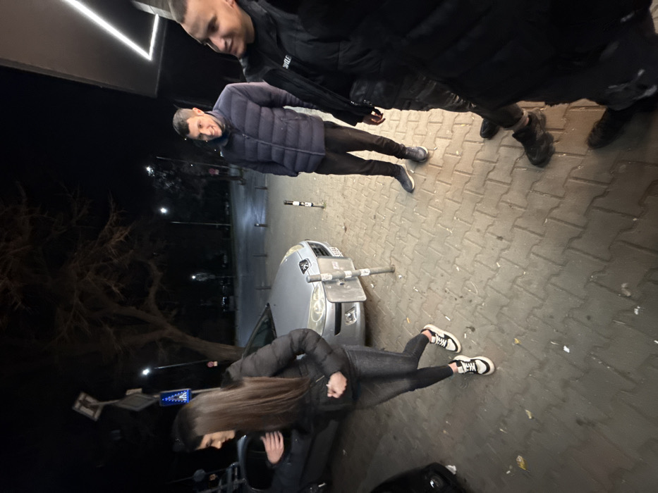 The image depicts an outdoor night scene in the city of Stara Zagora, Bulgaria. Three individuals are engaged in a casual interaction on a paved sidewalk adjacent to a street. On the left, a female subject with long, dark hair, wearing a dark puffer jacket, dark pants, and black and white sneakers, is captured in motion, turning her body towards the right. Her left hand is positioned near her waist, and her expression indicates a slight smile. To her right, a male subject with short, dark hair, dressed in a dark blue puffer jacket and dark pants, stands facing left, smiling. His hands appear to be in his pockets. Further to the right, a second male subject, partially visible and cropped on the right side of the frame, also with short, dark hair and wearing a dark puffer jacket, is facing left and smiling. In the background, a silver Peugeot sedan is parked facing the viewer. Its front license plate displays "CT 3168," confirming its registration in Stara Zagora. A black car is partially visible on the far left. The sidewalk is constructed from grey interlocking pavers, with several bollards separating it from the street. A large, bare-branched tree is situated behind the silver car. Streetlights illuminate the background road, and traffic signs are visible above the parked car. A building facade with a distinct linear LED light detail is present on the far right. The overall scene is dimly lit by artificial light sources, consistent with nighttime conditions.