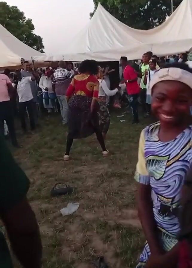 In an outdoor setting, possibly a celebration or gathering, a woman in a red and yellow patterned top and dark skirt is dancing in the center of a group of people