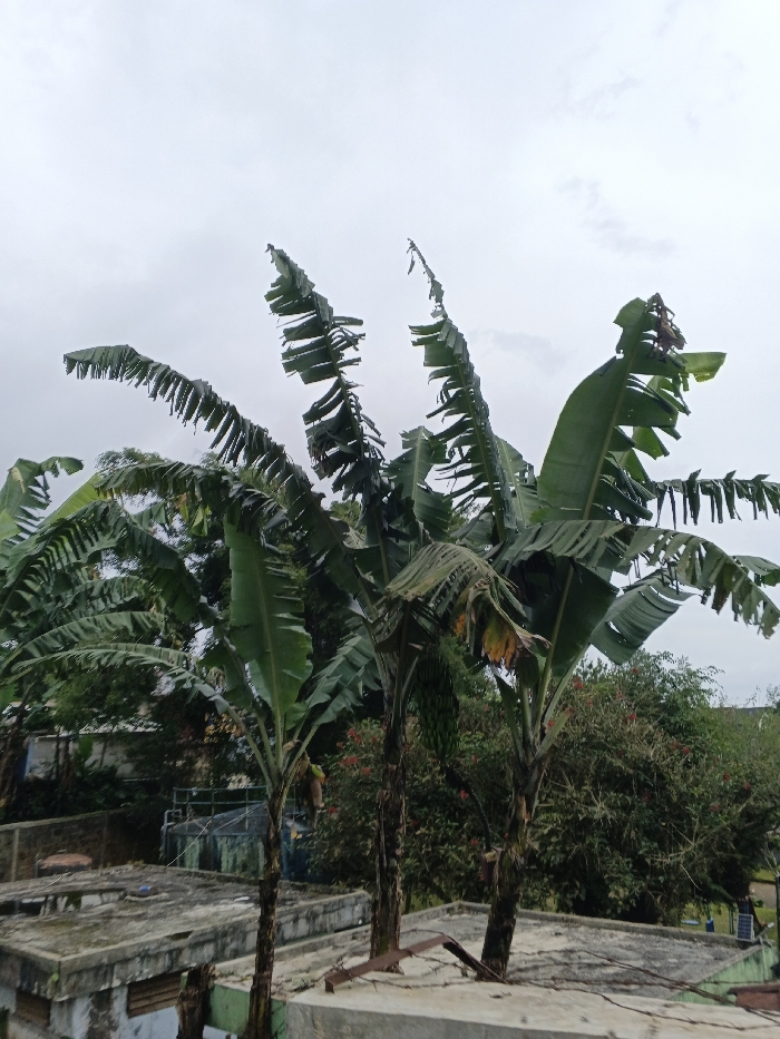An outdoor scene in Kabiufa, Papua New Guinea, captures a cluster of banana plants rising from behind concrete rooftops under an overcast sky. Three prominent banana plants with large, green, partially tattered leaves are centered, with two exhibiting bunches of green, unripe bananas. The plant to the left and the one slightly to the right of the center both display such bunches. The rooftops, primarily visible in the lower foreground, are flat, made of concrete, and show signs of weathering, including dark stains and irregular surfaces. Visible structural elements, possibly metal rods or beams, are present on the rooftops. Beyond the immediate banana plants and rooftops, dense tropical vegetation, including trees and shrubs with some red blossoms, forms a green backdrop. In the deeper background, obscured by foliage, glimpses of residential or utility structures, including a blue cylindrical tank, are discernible. The sky above is uniformly light gray, indicating heavy cloud cover. No individuals are present.