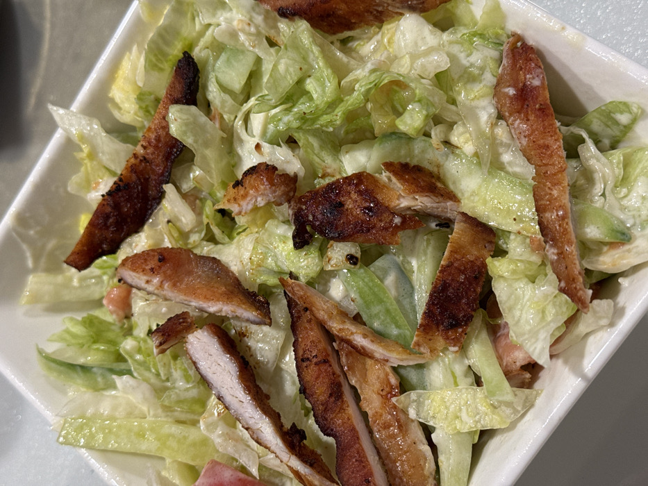 The image displays a close-up, high-angle view of a salad contained within a white, rectangular serving bowl. The salad consists predominantly of light green, chopped lettuce leaves coated in a creamy, off-white dressing. Interspersed throughout the lettuce are numerous irregularly shaped pieces of cooked meat, likely chicken or pork, characterized by browned and partially charred exteriors. The exposed cross-sections of some meat pieces reveal lighter, cooked flesh. Additional ingredients include elongated light green vegetable pieces, possibly cucumber or celery, and smaller, reddish-pink fragments, potentially tomato. Dark specks, consistent with ground pepper or other seasonings, are visible on various ingredients. The immediate background is an indistinct, blurry, light-colored surface. No people, discernible actions, or specific environmental details beyond the immediate bowl are present. The precise location within Haskovo, Bulgaria, cannot be determined from the visual information provided.