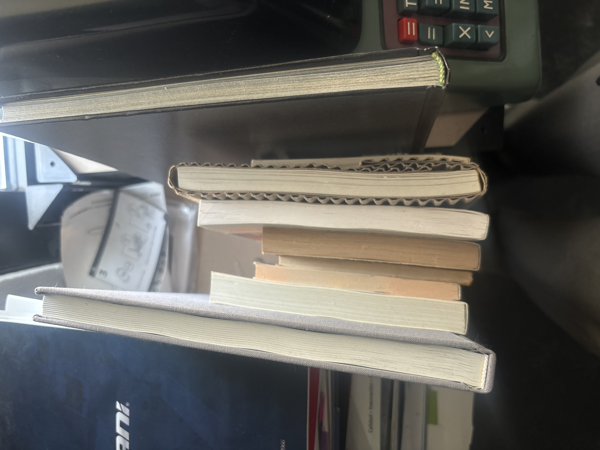 A stack of books sits on a surface. The top book has a dark cover. The second book has a cardboard-like cover. Below that, the books have light-colored covers, varying from white to tan. The bottom book has a gray cover. A calculator is visible in the upper right corner. Parts of documents are seen on the left and bottom of the frame. No people or specific actions are evident. The location is not identifiable as Buenavista, Mexico, or any specific place, from this image.