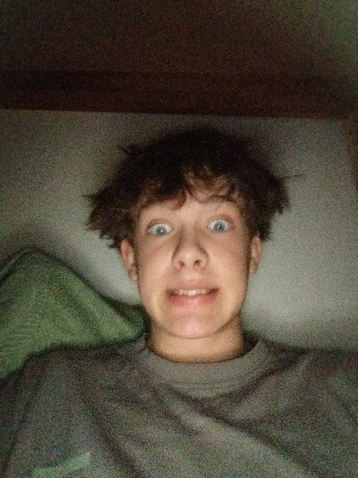 A dimly lit selfie captures a young person with fair skin, wide blue eyes, and disheveled brown hair. The individual is wearing a gray shirt. Their facial expression suggests surprise or amusement, with slightly parted lips and visible teeth. The background appears to be a bed or other cushioned surface, possibly under a low structure, based on the shadowed space above the subject's head.