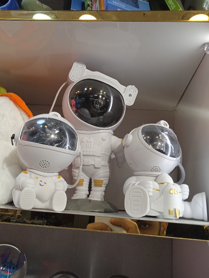 The scene is situated in what is identified as Barza Municipality, Syria. Three white, astronaut-themed novelty items are displayed on a white shelf, illuminated by small, warm-toned lights embedded in a golden trim directly above. The central item is a standing astronaut figure with a black, opaque visor and gold accents on its suit, positioned on a grey, moon-like base. To its left, a smaller, seated astronaut figure with a clear visor and a smiling face with stars on its chest holds a heart, with a partial orange and white plush object visible behind it. To the right of the central figure, another white, seated astronaut figure leans back, featuring a clear visor and a small white rocket with gold accents positioned beside its right leg. Below the main display shelf, a reflective surface shows a partial reflection of a person's face, including one eye and part of the forehead, suggesting the individual taking the photograph. Below this reflective surface is a dark grey, textured surface.
