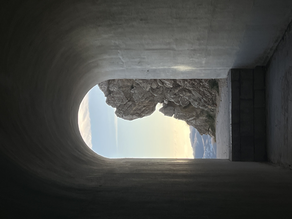 A view through a concrete tunnel reveals a rocky landscape. The tunnel's entrance is shaped like a rounded arch to the left. A more standard rectangular opening is to the right. Beyond, rugged mountains dominate the scene, contrasted by patches of blue sky. The illumination suggests either early morning or late afternoon. The tunnel's interior is dimly lit, highlighting the shapes of the concrete structure.