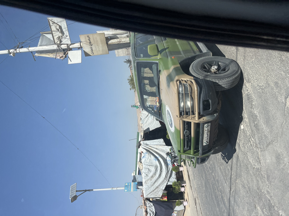 The image depicts an outdoor street scene in Mu'adammiyat ash-Sham, Syria, under a clear, bright blue sky. A camouflage-painted SUV, featuring a tan and green pattern, occupies the foreground and midground, viewed from its front-left quarter. The vehicle is equipped with a prominent, light-brown metal bull bar. A circular emblem is affixed to the center of the hood. The front license plate, visible below the bull bar, displays Arabic script reading "الرضوان" (Al-Radwan) at the top, with additional partially obscured characters and numbers below, appearing to include "10". The front driver's side tire and a black multi-spoke rim are visible. To the left of the SUV, a street side features several makeshift structures, likely stalls or shops, covered with grey and light-blue tarpaulins. A motorcycle is parked near these structures, and several small potted plants are arranged on the ground. A light pole with a solar panel and a blue sign bearing Arabic text stands vertically on the far left. To the right of the SUV, a utility pole is visible, supporting numerous overhead wires and multiple attached signs. One sign, light in color, prominently displays the Arabic text "الرضوان للغات" (Al-Radwan for Languages) and "مدرسة لغات" (Language School). The asphalt road surface shows signs of cracks and wear. The image framing suggests it was captured from within another vehicle, with a dark, vertical element partially obscuring the right edge. No human figures are discernible in the scene.