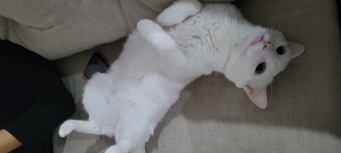 - "A white cat lies on its back on a textured surface, possibly a couch" by FM-lpZ3r2, licensed under CC BY 4.0