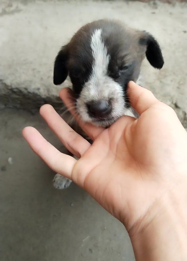 A person's right hand is interacting with a small, young puppy. The puppy has black and brown fur on its back and head, with a white stripe on its forehead and a white muzzle. The puppy stands on a concrete surface with pebbles and debris visible around its paws. The person's hand is gently touching and petting the puppy's head and face. The lighting is natural and the camera is positioned directly above the scene.