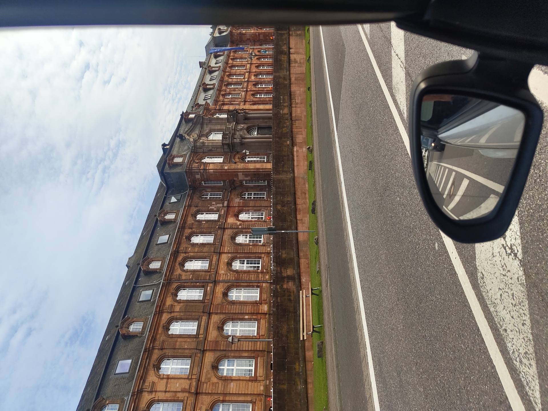 The image presents a view of the Villeroy & Boch headquarters, the former Mettlach Abbey, located in Mettlach, Germany. The scene is captured from the interior of a vehicle, looking towards the right. The prominent subject is a large, multi-story building constructed of reddish-brown sandstone, featuring numerous arched windows with white frames. The building has a dark, pitched roof with multiple dormer windows and rectangular skylights. A central, ornate section includes a grand entrance with pillars and a balcony. In the midground, a low, dark stone wall runs parallel to the building. Beyond this wall, a strip of green grass contains a single wooden bench and a black streetlight. The foreground consists of an asphalt road with a solid white lane line and a dashed white line. The vehicle's side mirror is prominent in the lower right corner, reflecting a white car behind it and a zebra crossing on the road. A portion of the vehicle's dark interior frame is visible on the far right edge of the image. The sky above is partially cloudy, displaying scattered white clouds against a blue background. No individuals are present in the scene.