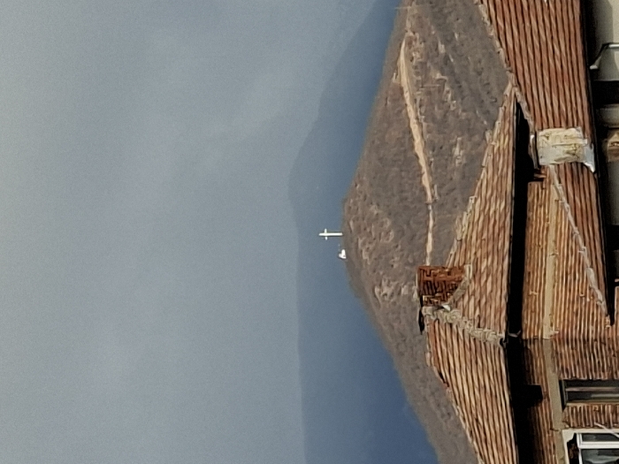 The image depicts a static scene in Krupnik, Bulgaria, looking towards a prominent hill. In the immediate foreground, the terracotta-tiled roofs of two residential structures are visible. The left building features a dark brown brick chimney and a partial window, with its exterior wall exhibiting horizontal elements. The right building shows a lighter, possibly stucco-clad chimney against its tiled roof. In the midground, a sparsely vegetated, brownish hill rises, exhibiting a winding dirt track or path on its slope. At the summit of this hill, a large white cross stands upright, with a smaller, indeterminate white structure positioned to its left. The background consists of darker, hazy mountains, suggesting atmospheric distance. The sky above is heavily overcast, ranging from dark to light grey, with a faint vertical lighter streak in the upper right quadrant. No people, discernible actions, or interactions are present.
