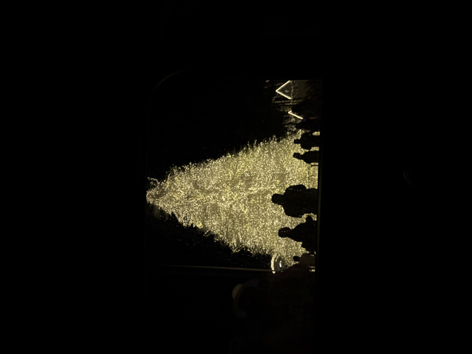 A dark photograph features a brightly illuminated rectangular object held up by a hand. The illuminated area contains a diffuse, tree-shaped pattern of light, resembling a Christmas tree made of sparkling lights. Along the right edge, the silhouettes of several people can be seen, as well as a triangular shape. The object is set against a stark black background.