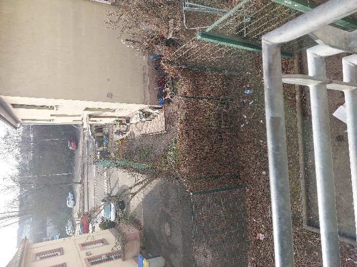 The image depicts an elevated, outdoor perspective of an urban residential area in Unknown, Unknown. In the immediate foreground, light grey metallic railings, consistent with a balcony or staircase, are visible, with a concrete surface directly below. The mid-ground features a brown, leaf-covered ground interspersed with scattered litter, including plastic bottles and wrappers. A green wire mesh fence runs horizontally, separating the foreground from a lower courtyard or garden area. To the left, a light-beige multi-story building with reddish-brown window sills stands adjacent to a paved area where two refuse bins (one yellow, one blue) are positioned. A bare-branched tree is centrally located within this section. The garden area between the buildings is covered in fallen leaves, with a dirt path leading towards the right-hand building. Two individuals are observed within this garden; one is seated or kneeling, clad in dark clothing with a light head covering, accompanied by another less distinct figure. A small red bicycle, several green waste bins, and various unidentified discarded items are clustered near the base of the right-hand building. The background reveals a paved street or driveway occupied by multiple parked vehicles, including white and red cars. A dark metal gate secures an entrance to this street. Beyond the street, a line of bare trees borders an elevated, dark-faced embankment or terrain feature. Distant urban structures are faintly discernible against a bright, hazy sky. The overall scene suggests a late autumn or winter season in an urban residential setting.