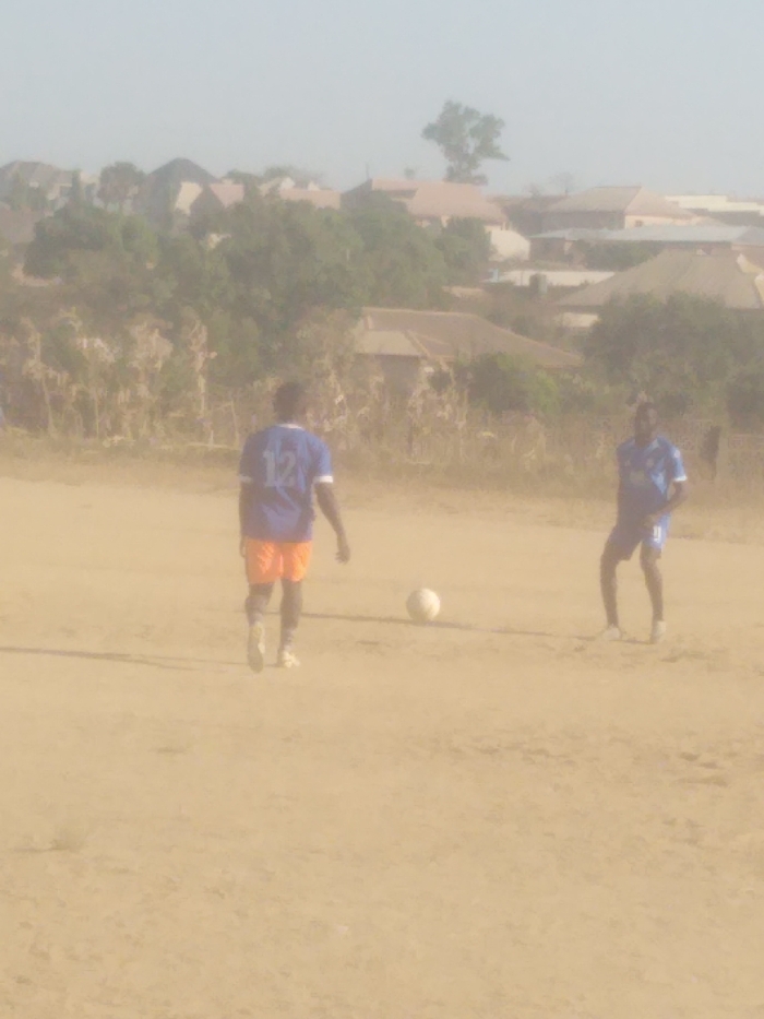 The image displays an outdoor scene in a residential area of Jos, Nigeria, characterized by a pervasive hazy or dusty atmosphere. Two males are present on an unpaved, light brown dirt field, appearing to be engaged in soccer. The individual on the left is viewed from behind, walking towards the right side of the frame. He wears a blue short-sleeved jersey with the number "12" in white on the back, orange shorts, and light-colored footwear. The individual on the right is standing with his body angled towards the left, legs slightly bent. He wears a blue short-sleeved jersey, dark shorts, and light-colored footwear. An indistinct number is visible on the front of his jersey. A white soccer ball rests on the dusty ground between the two individuals, positioned slightly closer to the subject on the right. The background features a mix of sparse, dry vegetation and multiple low-rise residential buildings. These structures have light-colored walls and predominantly reddish-brown roofs. Further in the distance, additional buildings and trees are visible, with the silhouette of a bare, dark tree prominent against the light, hazy sky. The overall lighting is diffused, contributing to the muted color palette of the scene.