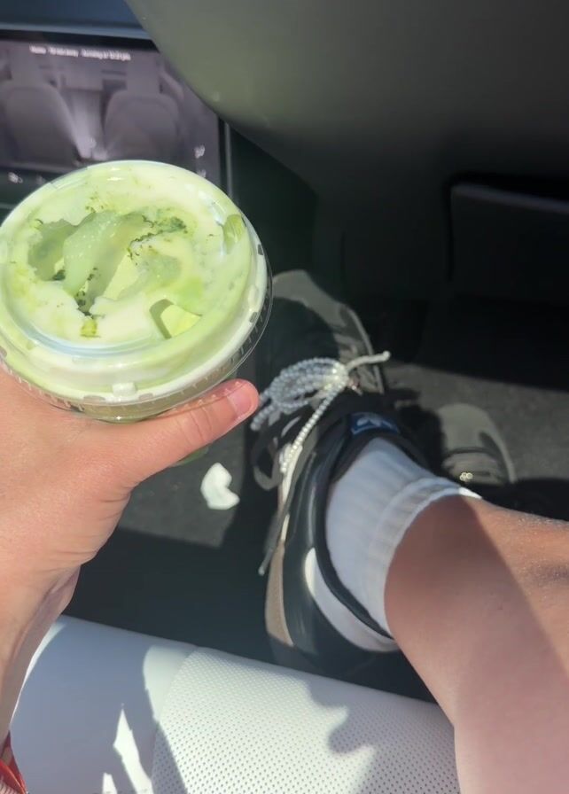 A person is seated in a car holding a plastic cup with a green and white beverage, possibly a matcha latte. The person is wearing white socks and black and white sneakers. The car interior is black with white perforated leather seats. The car's infotainment screen is visible. The scene is well-lit, suggesting it is daytime.
