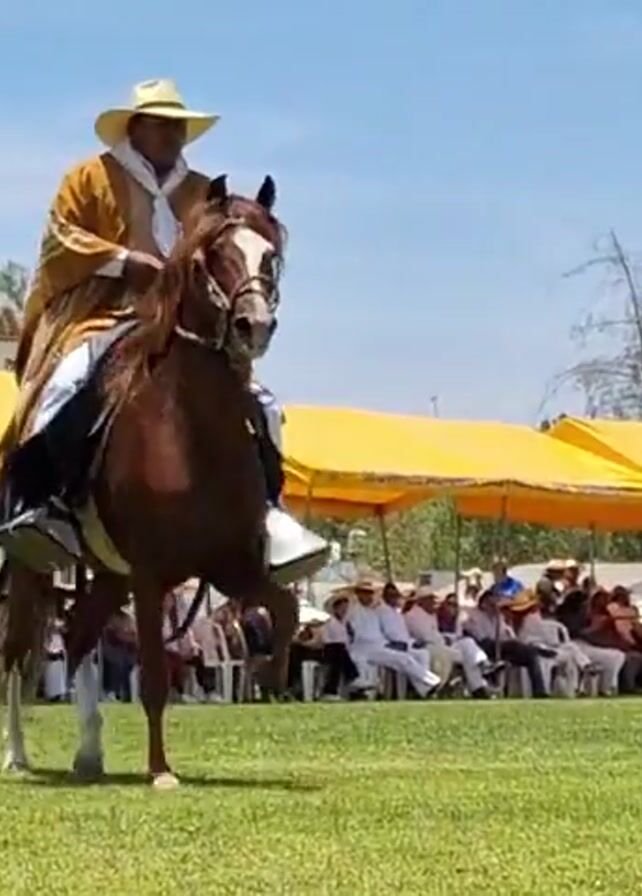 A man wearing a straw hat and a yellow and brown poncho rides a brown horse in a grassy field. The horse is decorated with white socks on its legs, and its tail is long. The man sits upright in the saddle. Behind them, there is a crowd of people sitting in chairs under yellow tents. The sky is blue and there are a few trees in the background. The camera follows the horse and rider as they move across the field.