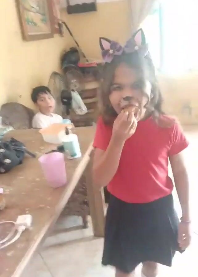 A young girl dressed as a cat stands near a table in a bright room. She wears a red shirt, black skirt, white socks, and black shoes. She has cat ears with a purple bow and whiskers drawn on her face. She holds something white, possibly food, in her hand. A young boy sits at the table in the background. A fan, pink cup, and other objects are also on the table. The girl speaks, and then steps forward toward the camera, causing blurriness.