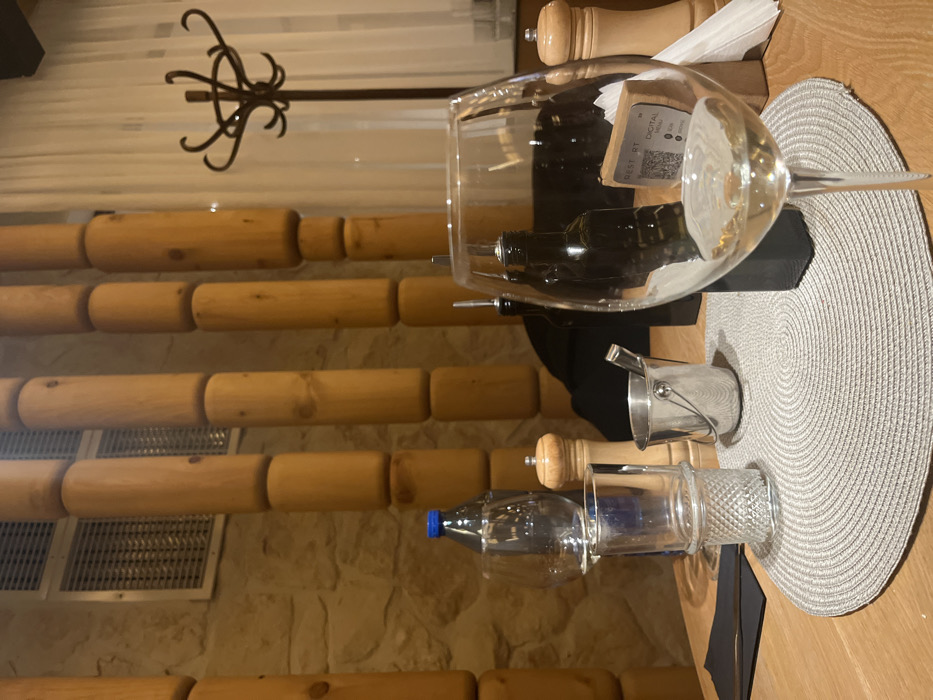 The image depicts an indoor dining scene within what appears to be a restaurant or similar establishment in Smolyan, Bulgaria. The foreground is dominated by a light wooden table set with a round, gray woven placemat. On the placemat, a large clear wine glass, partially filled with white wine, stands prominently on the right. Behind it, a dark-colored bottle with a pour spout is visible. To the left of the placemat, a folded black napkin is present. Other items on the table include a clear glass tumbler with a patterned base, an empty clear wine glass, a plastic water bottle with a blue cap, and a small silver bucket containing tongs. Two wooden salt or pepper grinders are positioned on the table, one to the left of the silver bucket and another further right near a stack of white paper napkins. A small rectangular card displaying "REST RT DIGITAL MENU" and a QR code is visible near the rightmost wine glass and napkins. The background features a wall constructed from light-colored, irregular stone blocks. Several tall, cylindrical wooden pillars are vertically arranged against this stone wall. A metal ventilation grate is installed high on the wall. To the right, white, sheer curtains cover a window, and a dark metal coat rack with multiple hooks stands in front of the curtains. No individuals are visible, and no active interactions are depicted. The scene is illuminated by warm, artificial lighting.