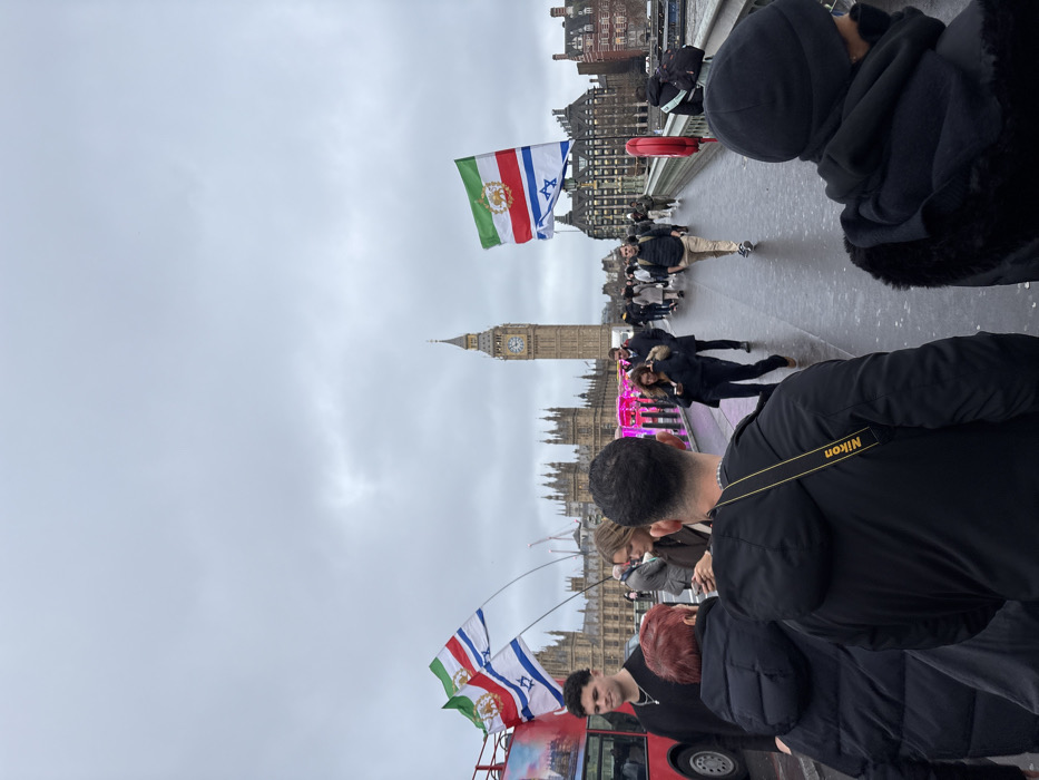 A political demonstration is happening on a bridge in front of Big Ben and the Houses of Parliament. A red double-decker bus is also visible. Several people stand and walk on the bridge, with flags featuring the Star of David and Iranian symbols raised. The sky is overcast, and several individuals are wearing winter clothing. A person with a Nikon camera strap is in the foreground.