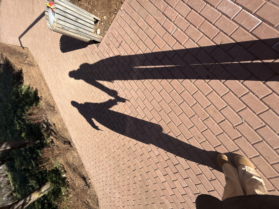 The scene depicts a sunlit outdoor pedestrian pathway in Ifrane, Morocco. Two distinct human shadows, cast long on the reddish-brown interlocking brick pavers, are holding hands. The shadow on the left, slightly more defined as male due to a broader outline, grips the hand of the shadow on the right, which appears to be female. In the immediate foreground, the lower legs and feet of a person, clothed in light-colored trousers and tan flat shoes, are visible, indicating the perspective of the photographer. The pathway extends into the background, flanked by unpaved ground featuring green vegetation, scattered small, leafless bushes, and tree trunks. To the right of the path, a wooden slatted waste bin with colorful refuse partially visible at the top stands next to a lamppost, both casting long shadows. Strong, angled sunlight illuminates the scene, creating sharp, elongated shadows.