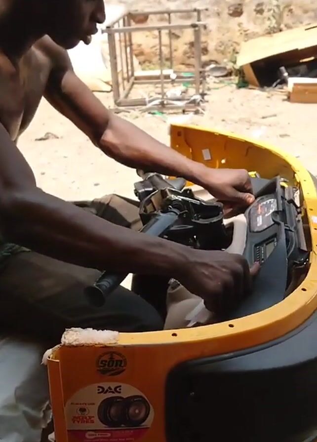 A shirtless, dark-skinned man works on the dashboard of a yellow auto rickshaw. He sits on a white-covered part of the vehicle, using his hands to manipulate components behind the instrument panel. The surrounding environment appears to be an outdoor workspace with scattered tools, cardboard boxes, and metal structures visible in the background. The auto rickshaw is partly assembled with its main body and frame visible. Stickers are present on the side of the vehicle.
