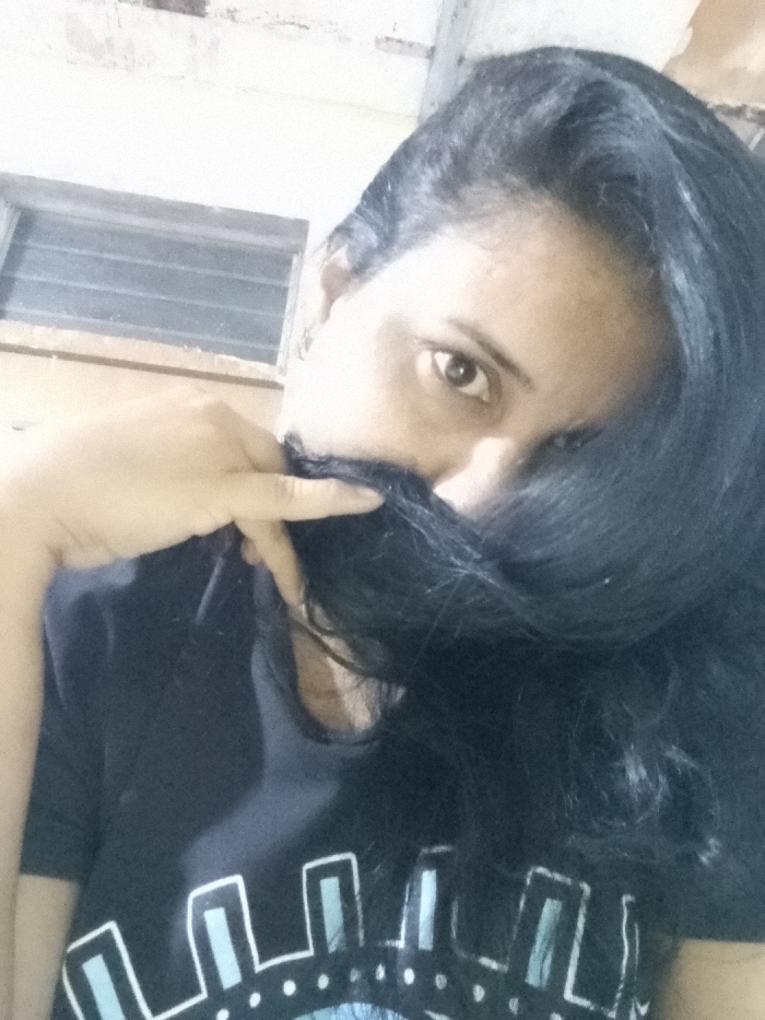 A woman with dark, wavy hair partially covering her face looks directly at the camera. Her hand is holding a section of hair near her mouth. She has brown eyes and fair skin. She wears a dark t-shirt with a white and grey graphic design. The background is slightly blurry and features a window with horizontal blinds. The lighting is dim, creating shadows on her face and the surrounding environment.