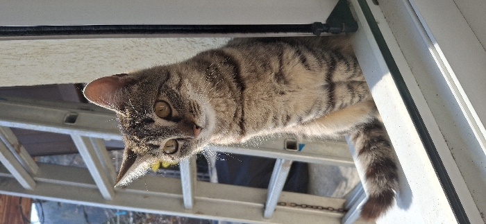 - "A domestic tabby cat, characterized by brown, grey, and cream striped fur, is seated upright on a white PVC window sill" by FM-VQdth2, licensed under CC BY 4.0
