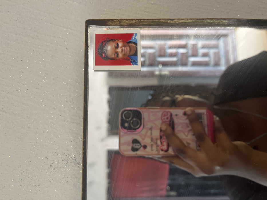 The image depicts a mirror selfie captured in Gbongan, Nigeria. A dark-skinned individual holds a pink-cased smartphone, obscuring their face, while taking the photograph of their reflection in a rectangular mirror. The visible hand holds the phone with a light-colored thumb nail polish. The smartphone case features a heart with the number "8", stars, and indistinct text. The phone's camera module has two prominent lenses. The mirror surface exhibits smudges and linear scratches. Affixed to the upper right corner of the mirror is a small, portrait-oriented photo of a young Black female. She has braided hair styled with red accents, wears visible eye makeup, and is dressed in a blue and white patterned top over a dark garment, against a solid red background. The mirror's reflection reveals an interior space. To the left, a section of red fabric or curtain is visible. To the right, a door or screen with a distinct brown, geometric patterned grille or carving is reflected. The mirror is framed by a dark, possibly wooden or metallic, border. Above the mirror, a light-colored wall with a fine, glittery or textured finish is visible.