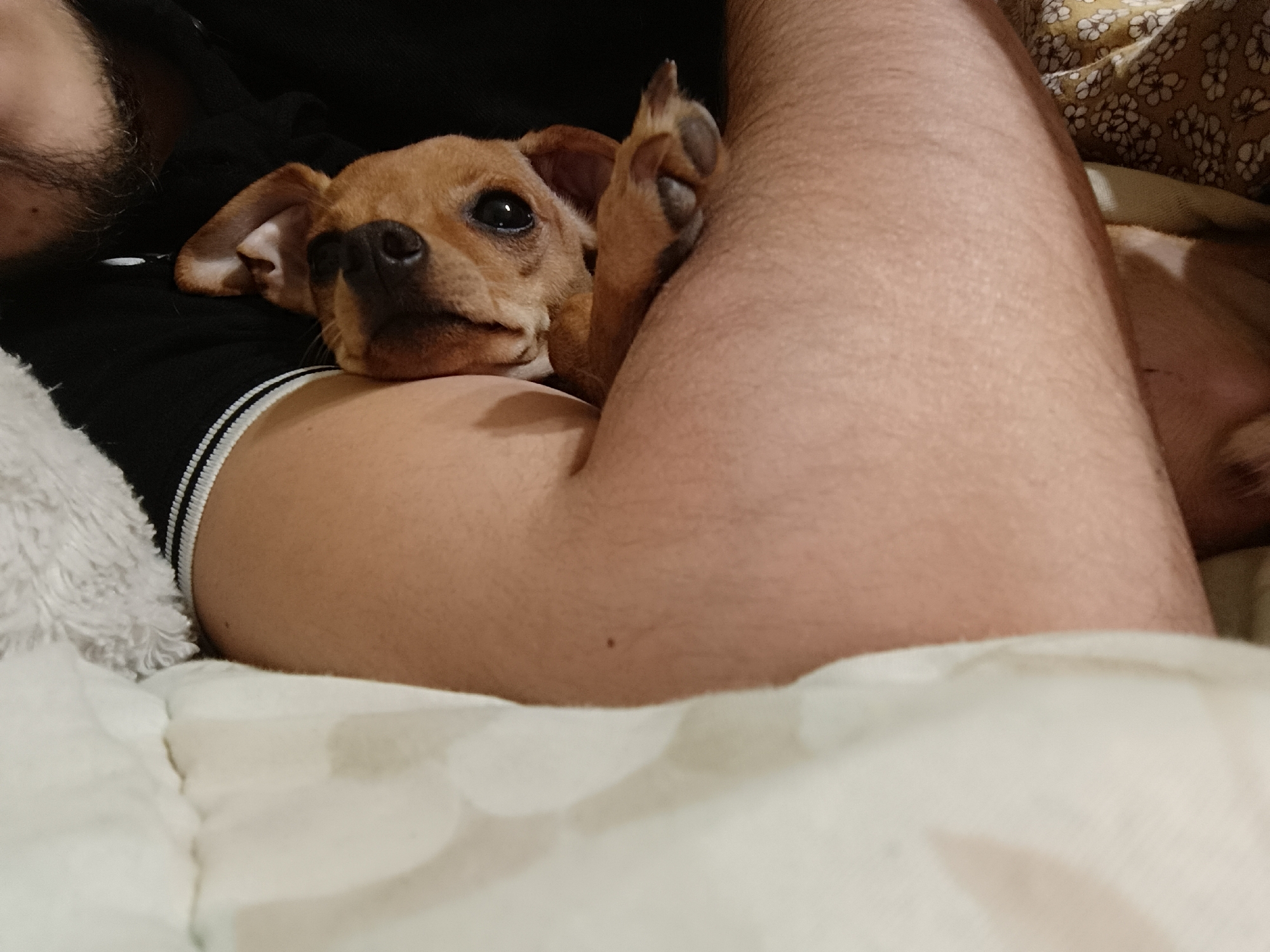 A brown, short-haired dog is nestled in the crook of a person's arm. The dog's head rests on the person's arm, and its front paw is visible next to the arm. The person is wearing a dark shirt with white stripes. The scene is set on a bed with a white blanket and a floral patterned pillow. The location is unknown.