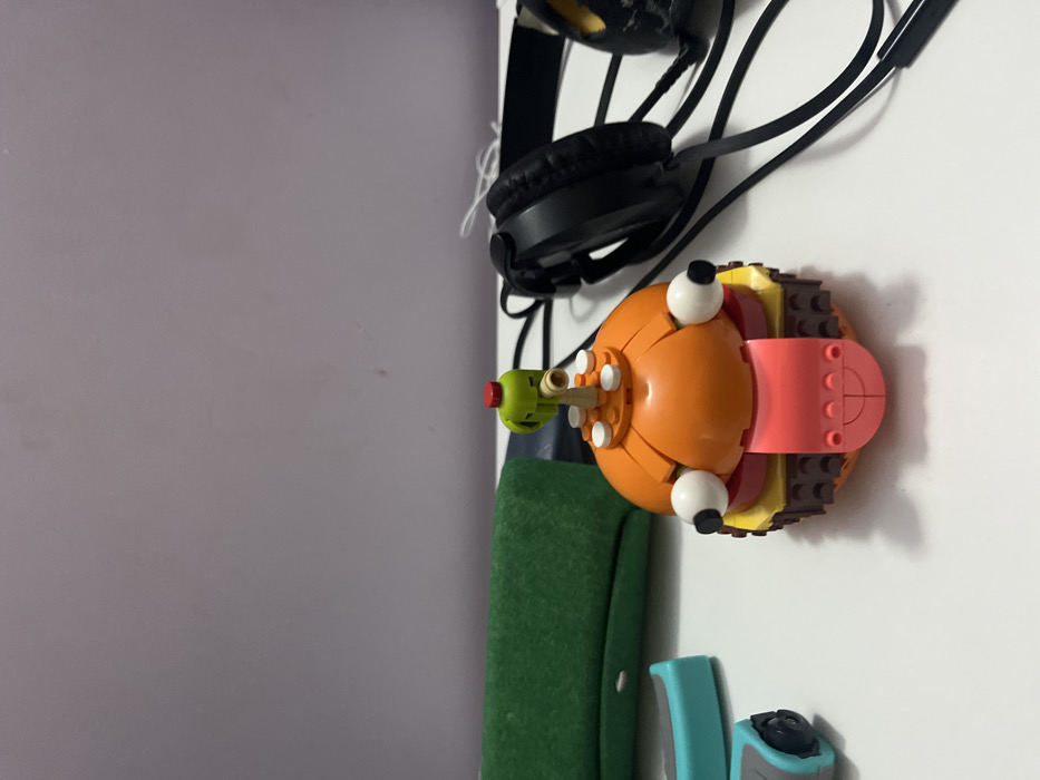 - "A Lego Krabby Patty, complete with a green pickle nose and googly eyes, hangs near two pairs of black headphones" by FM-YFYOS2, licensed under CC BY 4.0