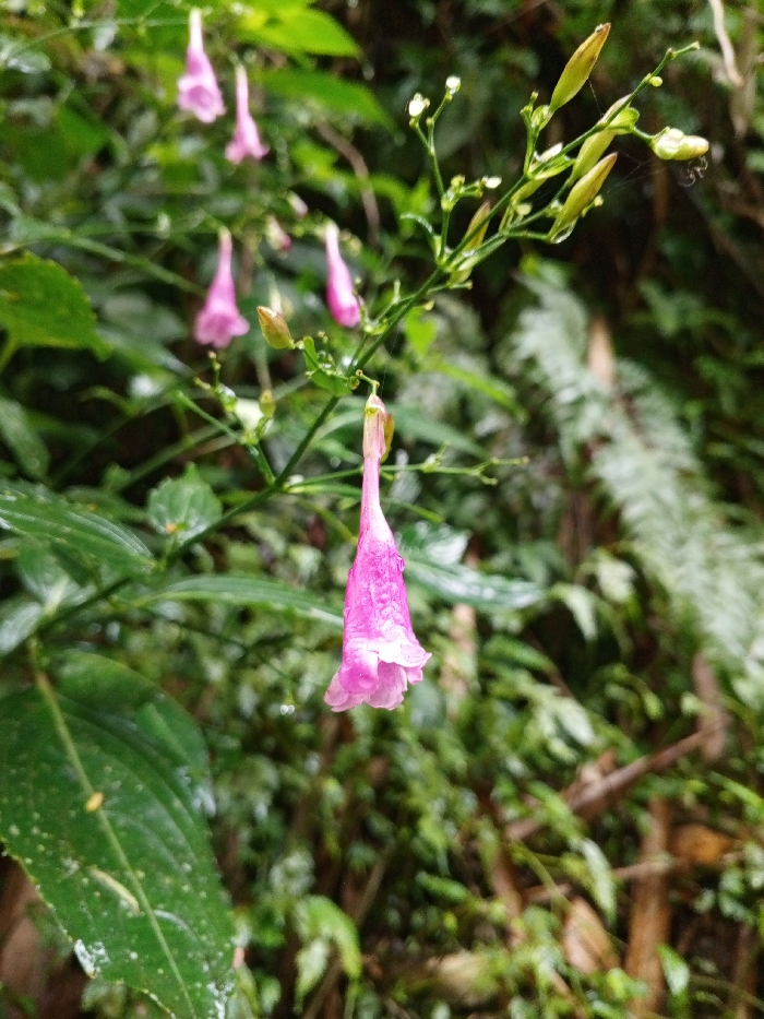This image captures a close-up view of vibrant pink flowers and green foliage in Silvino Lobos, Philippines. The primary subject is a single, prominent, bell-shaped pink flower hanging downwards, positioned centrally in the lower half of the frame. This flower is in sharp focus, exhibiting visible water droplets on its petals and stem. Above and to the left of this flower, several other similar pink flowers, some open and some still as green, elongated buds, are present on slender green stems, appearing slightly out of focus. A subtle spiderweb is visible among the buds in the upper right portion of the frame. The surrounding environment consists of dense, lush green vegetation, including broad, wet leaves in the lower left foreground and blurred fern-like structures in the mid-background, indicating a moist, natural setting. No human subjects or man-made objects are discernible.