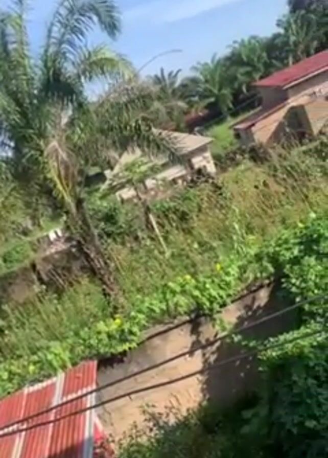 The video presents a static, slightly tilted view of a tropical landscape under a bright, partly cloudy sky. Predominantly, the scene is dominated by lush green vegetation including tall palm trees, dense bushes, and overgrown grass. Some yellow flowers are visible in the foreground. In the background are several buildings with red roofs, suggesting a residential or community setting. The camera's viewpoint seems to be from an elevated position, overlooking the scene. In the foreground, a red corrugated metal roof is partially visible, adding a distinct element to the otherwise natural setting. Overhead, dark power lines cut across the visual frame.