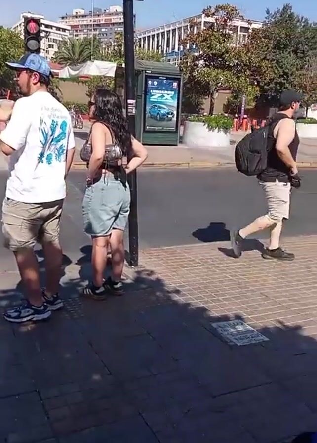 n urban street scene on a sunny day. Three pedestrians are visible: A man and woman standing on a sidewalk waiting for a crosswalk signal to change, and another man crossing the street. The man on the sidewalk wears a white T-shirt with a blue graphic, khaki shorts, a blue baseball cap, and blue and white sneakers. He is holding a cup with a straw and appears to be drinking from it. The woman next to him wears a patterned top, denim shorts, and sandals. The man crossing the street wears a black tank top, khaki shorts, a black backpack, and black sneakers. Traffic is visible on the street. Buildings, trees, and a traffic light pole are in the background.