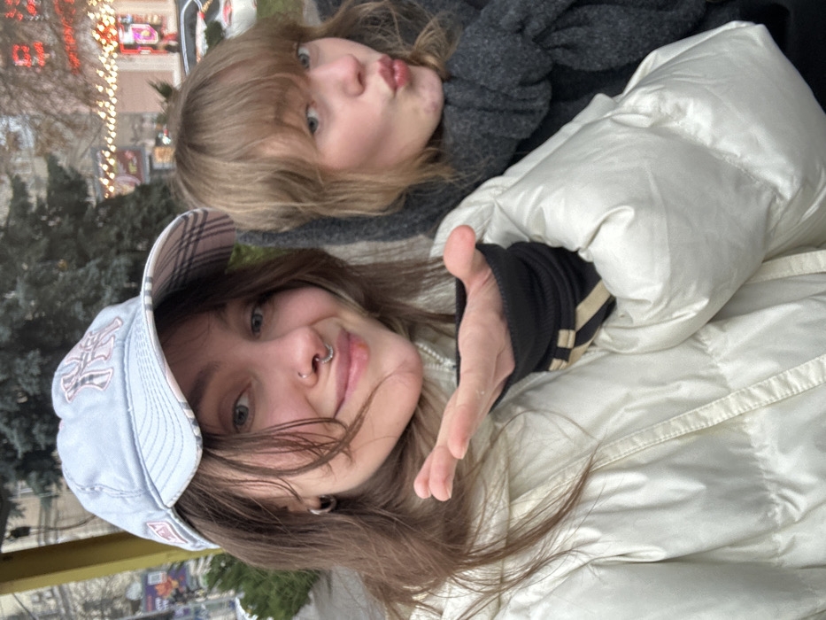 The image captures two young adult females in a selfie outdoors on a commercial street in Dnipro, Ukraine