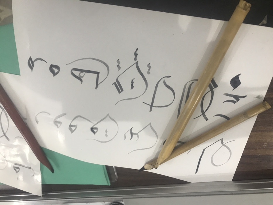 The image displays a close-up, angled overhead view of a calligraphy workspace