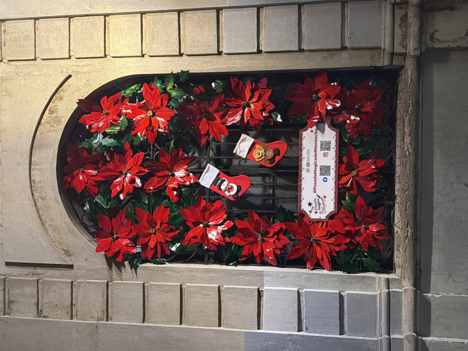 A window is decorated with a Christmas display. Red poinsettias and green foliage fill the window space, creating a festive wreath effect. Two small, red Christmas stockings hang within the arrangement. One stocking has a Mickey Mouse design, and the other features a snowman. A white tag is also displayed, featuring the text "#PosadaMagicaDelMontecito" and QR codes. The window frame is a light-colored stone or concrete material with a decorative pattern.