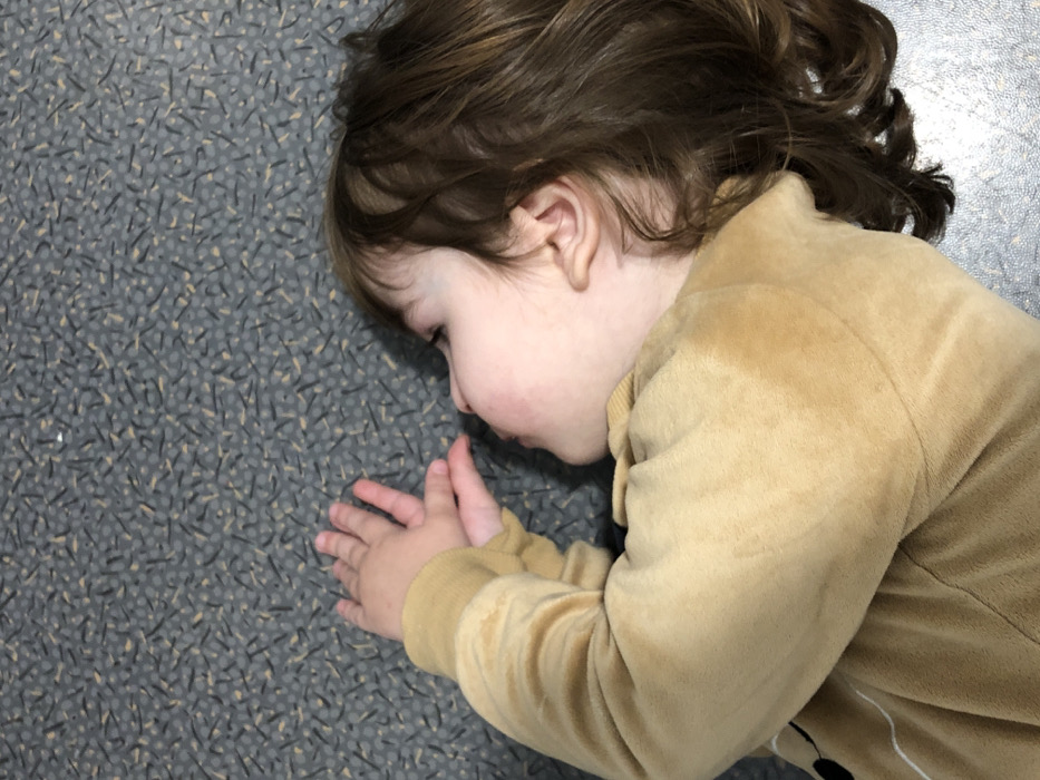 A young child with curly brown hair lies on a patterned gray and brown surface, possibly a rug or floor