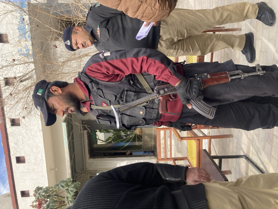 The image displays an outdoor scene in Quetta City Tehsil, Pakistan, under bright, partly cloudy daylight. In the immediate foreground, to the left, a male is partially visible from the back, wearing a dark, possibly black, ribbed sweater and light-colored pants. Centrally, a male individual in his 20s or 30s, with a dark beard, stands holding an AK-pattern rifle in his right hand, resting the barrel vertically against the ground near his right foot. He wears a black tactical vest over a red and black long-sleeved top, black tactical gloves, black pants, and a black baseball cap with "POLICE" text and a Pakistani flag patch. His gaze is directed leftward. To his right, another male, an older police officer, stands wearing a dark blue uniform, including a beret with a crest, medals/ribbons on his left chest, and a Pakistani flag patch on his right arm. He holds white papers in his left hand and also looks leftward. In the mid-ground, two light-colored wooden chairs with woven yellow seats are visible, along with a dark rectangular table partially obscured on the left. In the background, a light-colored two-story building with small square windows and a flat roof is present. An open doorway on the building reveals a partial view of a fifth male inside and a large green plant. Bare-branched deciduous trees or shrubs are visible to the right of the building. The ground is paved, appearing to be concrete or light-colored tiling.