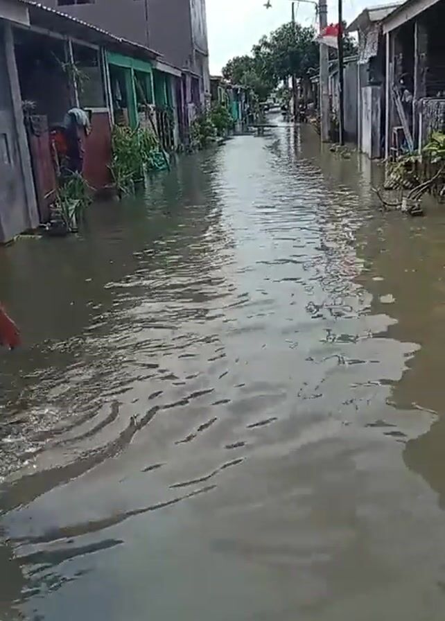 flooded street in a residential area. Water levels reach the bottom of house walls. Houses line both sides of the street. One person is seen wading through the water. Trash cans and plants are visible along the edges of the houses. Overhead power lines are visible. The water is murky.