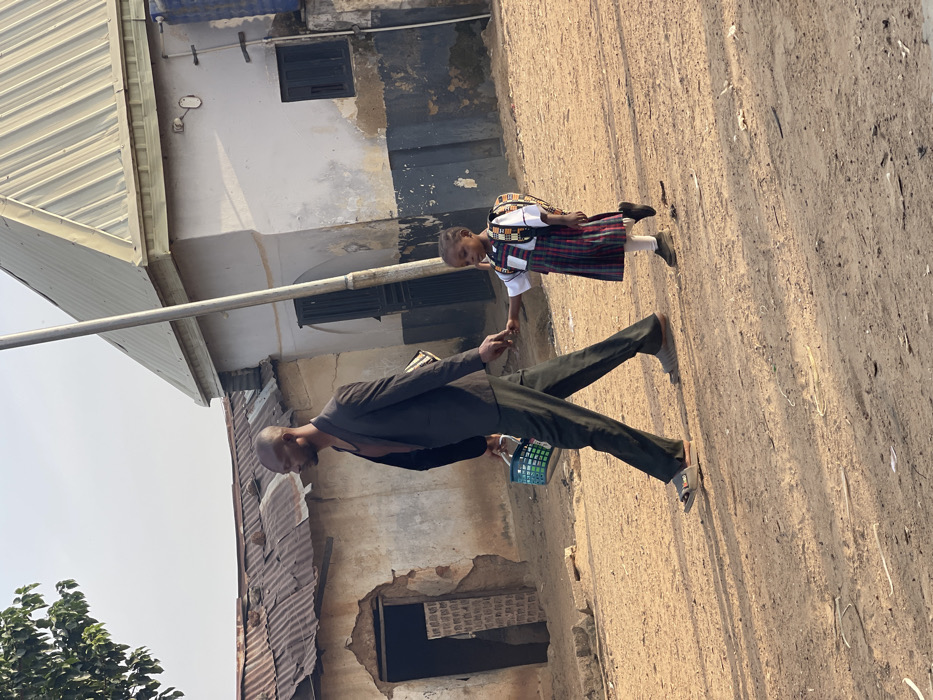 An adult male and a young female child walk hand-in-hand along an unpaved dirt path in Muchiya, Nigeria