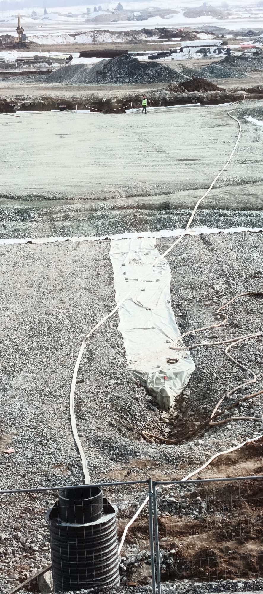 The image depicts an active construction site in Bolshoye Savino, Russia, under overcast skies, with ground conditions indicating cold weather or early spring. The foreground shows an open-pit excavation with a black, corrugated plastic pipe standing vertically behind a chain-link fence at the bottom left. The immediate ground consists of coarse gray gravel and dark brown soil. Multiple white hoses or cables traverse the gravel, leading towards and into a trench. A rectangular sheet of white material, possibly a geotextile or tarp, lies across the gravel, weighted by several rocks, and extends into a deeper trench section where it encloses an unseen object. Several U-shaped rebar pieces are scattered near the trench. In the midground, a large, flat expanse of light gray, compacted or frozen ground is visible. A single individual, wearing a yellow-green high-visibility vest and an orange hard hat, walks across this flat area from right to left, positioned near a shallow horizontal excavation line marked by a white barrier or rope. The background features extensive mounds of dark gray aggregate, brown soil, and snow-covered terrain. Distant structures, including what appears to be a drilling rig or crane and a container marked "TEC," are visible against a snowy horizon.