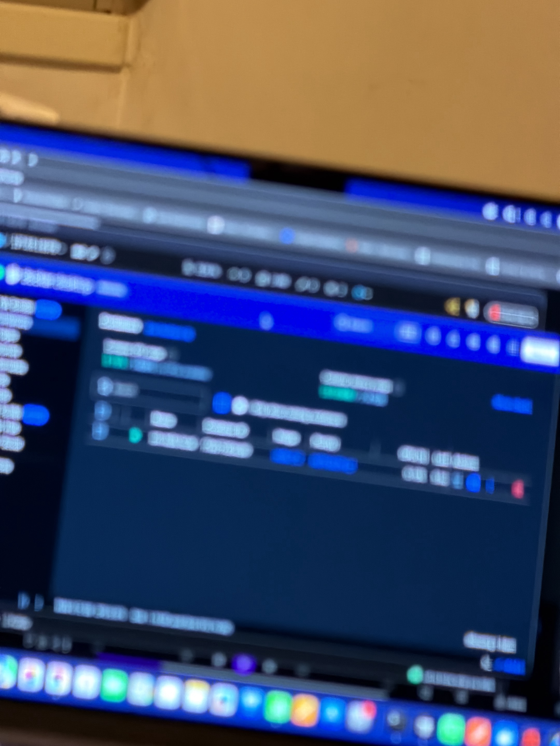 The image depicts a close-up, out-of-focus view of a computer monitor displaying a graphical user interface, observed indoors in Kafr Yasif, Israel. The monitor screen is illuminated, showing a predominantly dark-themed interface with blue and grey elements, along with scattered lighter areas representing unreadable text, icons, or interface components. A row of colorful application icons, consistent with a taskbar or dock, is visible along the bottom edge of the screen. The entire display is blurred, precluding the identification of specific software, content, or textual information. A light-colored wall or surface is visible in the blurred background above the monitor. No individuals are present in the frame, and no specific actions or interactions are discernible beyond the computer being powered on and displaying a user interface.