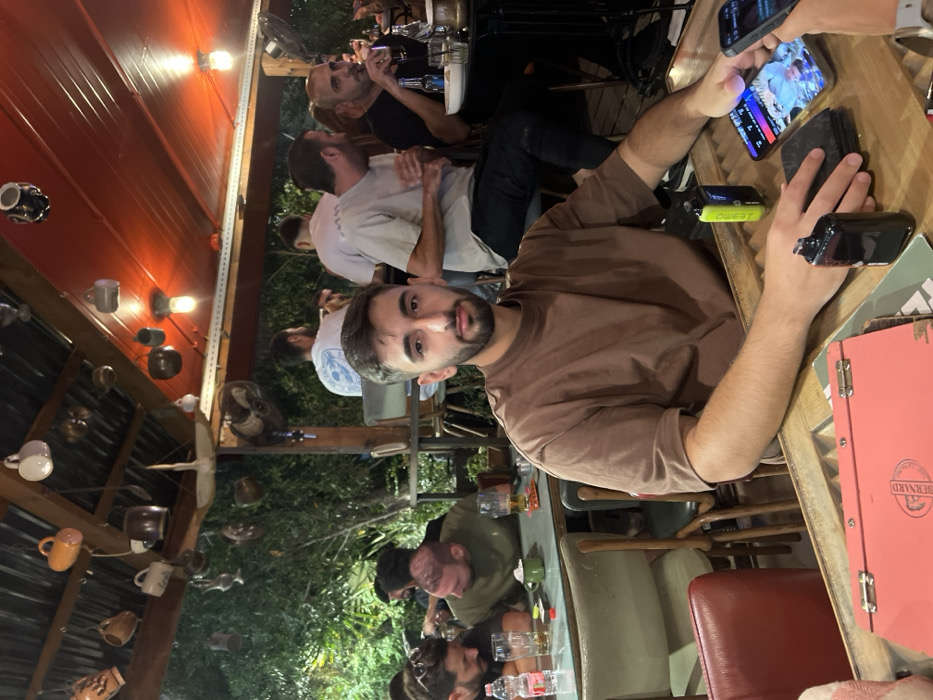 The image depicts an evening scene inside "Bernard Bar & Restaurant," located at Rothschild 88, Rishon LeZion, Israel. In the foreground, a young adult male with dark hair and a short beard, wearing a brown t-shirt, is seated at a light wooden table, looking directly at the camera. On the table in front of him are two electronic vape devices (one black, one black and yellow), a dark wallet, and two smartphones; one phone screen displays an image. A red menu folder, branded "BERNARD," is visible on the left side of the table. In the background, several other adult males are seated at various tables, engaged in conversation, drinking, and social interaction. Visible objects on their tables include glasses of amber liquid, a clear plastic water bottle, and a white bowl. The establishment features a red corrugated metal roof supported by wooden beams, from which numerous ceramic mugs and other decorative household items are suspended. Exposed light bulbs and ceiling fans provide illumination and air circulation. Lush green foliage is visible beyond the seating area, indicating an outdoor or semi-outdoor patio setting. Tables are a mix of light wood and metal, with chairs of diverse styles, including some with red upholstered backs. The overall lighting suggests an evening or nighttime ambiance.