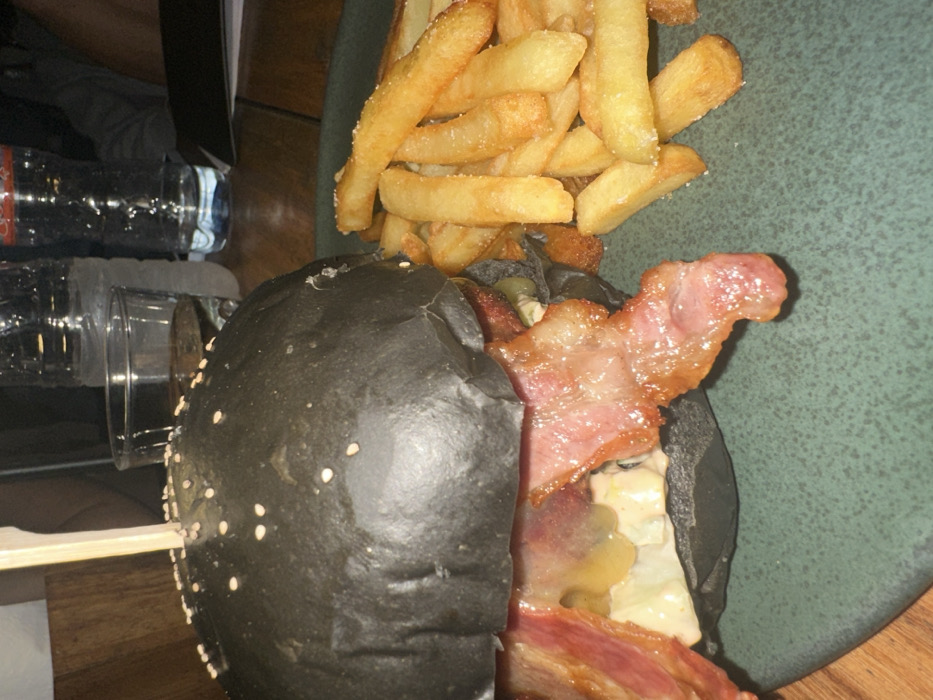 This image presents a close-up, elevated view of a meal served in Koh Tao, Thailand. The primary subjects are a burger and a side of french fries, displayed on a dark green, speckled plate. The burger features a distinctly dark black bun, which is topped with scattered white sesame seeds. A light-colored wooden skewer or toothpick is inserted vertically through the center of the top bun. Visible between the bun halves are multiple strips of cooked bacon, characterized by their reddish-pink color and slightly irregular, crispy texture. Beneath the bacon, layers of creamy, off-white sauce, a yellowish-orange sauce, and what appear to be green vegetable components are discernible. Adjacent to the burger, a pile of golden-brown, thick-cut french fries occupies the right side of the plate. The fries show visible salt crystals on their surfaces. In the blurred background, several clear plastic water bottles are present, along with a clear glass containing a dark liquid. A dark wooden surface, likely a table, is partially visible. An indistinct dark form in the upper left background suggests the presence of another person or object in the dimly lit environment.