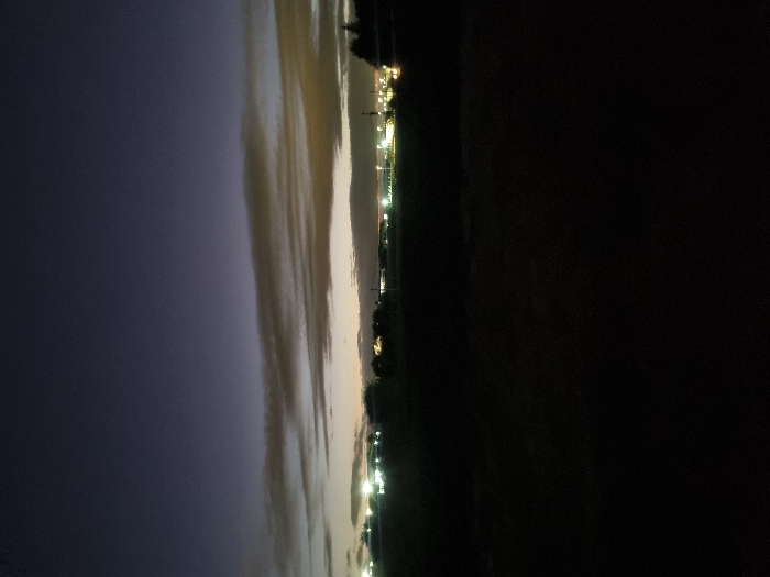 The scene depicts the outskirts of Moguer, Spain, during late dusk or nighttime. The upper portion of the frame shows a dark indigo-blue sky, transitioning to lighter grey and faint orange hues near the horizon, where multiple elongated stratiform clouds are visible. Below the clouds, along the distant horizon line, an urban or industrial area is indicated by numerous scattered bright yellow-white artificial lights. Indistinct dark silhouettes, likely trees or structures, are present between the immediate foreground and the distant illuminated area. The lower half of the image is rendered almost entirely dark, revealing only an undifferentiated, dark terrain, characteristic of an open field or unlit landscape. No people, specific objects, or actions are discernible within the frame.