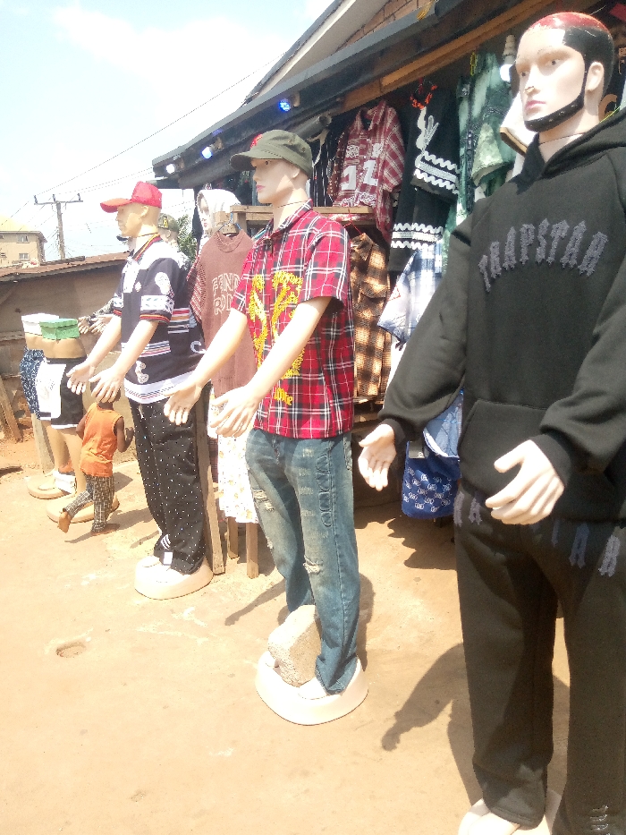 The scene is an outdoor clothing display in Nsugbe, Nigeria, under a bright, clear sky